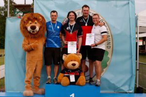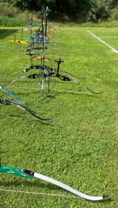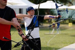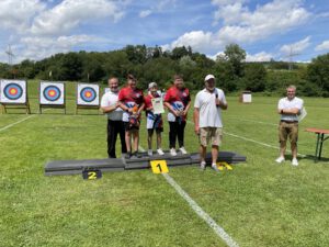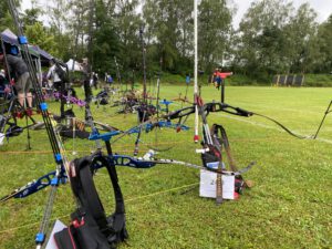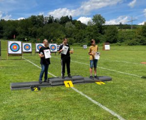 In entspannter und freundlicher Atmosphäre war das Turnier als 1.440er Runde für sich selbst schon eine Belohnung für die Teilnehmer. Unser Schützen-Team konnte eine konstante Leistung abrufen und erreichte mit einem Kraftakt – der Wetterbericht versprach nichts Gutes für den Turniertag und die angesagten Niederschläge kamen tatsächlich – einen 2. Platz (Herbert, Recurve Senioren) und einen 3. Platz (Angelo, Recurve Schüler A). Für Thomas (Recurve Master) war der Wettkampf noch etwas durchwachsen, musste bei sich wechselnden Regen- und Trockenphasen doch immer wieder die richtige Visiereinstellung gefunden werden. Letztendlich reichte es für einen 8. Platz und einen wohlverdienten 1.000er Stern.
